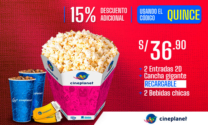 Cineplanet: 2 entradas 2D + 2 bebidas + cancha gigante recargable.